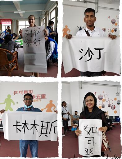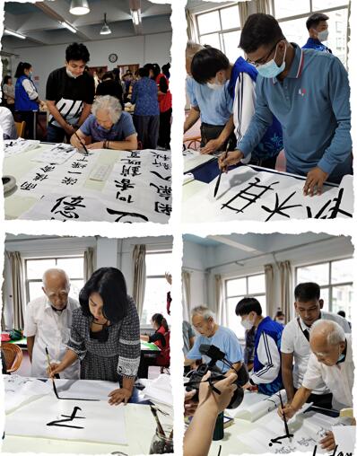 接着,他们跟着资深书法老教师练习书法,他们认真地学习写自己的中文名字,看着自己的书法成果,大家满心欢喜。