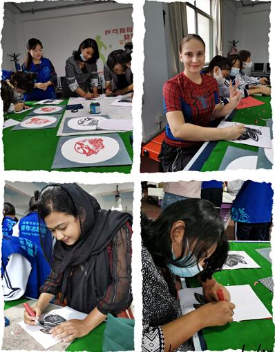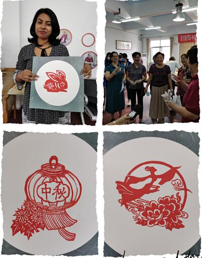 国际员工还纸刻嫦娥、玉兔、月亮、灯笼等关于中秋节的纹样,听社区阿姨讲中秋节的故事,跟着社区阿姨学习中秋节的歌曲,他们激动无比。