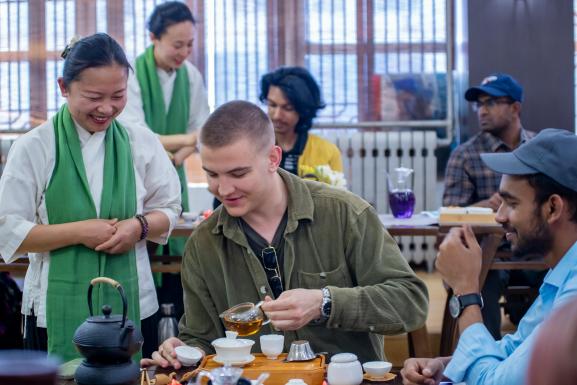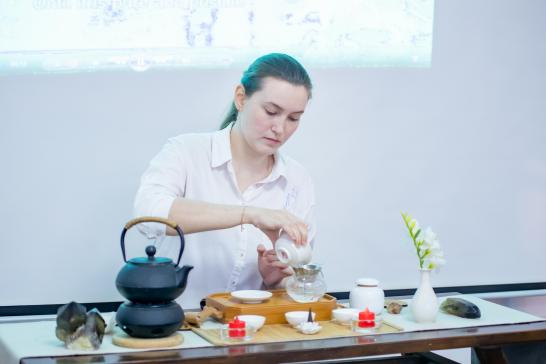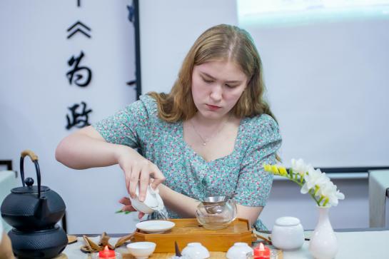 伴随着悠扬的禅乐,金老师先为国际员工介绍了黄河非遗文化中的茶文化,讲解了茶的制作过程与工艺,然后与茶艺师们一起进行了中国传统茶道展演,并展示了泡茶工序。她们动作轻柔,如行云流水般,短短几分钟的茶艺表演让国际员工们叹为观止。随后员工们在茶艺师们的示范和指导下动手操作,亲自体验了烫盏、投茶、冲泡、分茶、奉茶的茶道工序。“中国的茶道真的很有意思!”“没想到喝茶还有这么多的文化含义,我以前一点儿也不了解。”“中国文化真的很了不起。”……在场员工们纷纷表示,对中国的文化之精深赞叹不已。