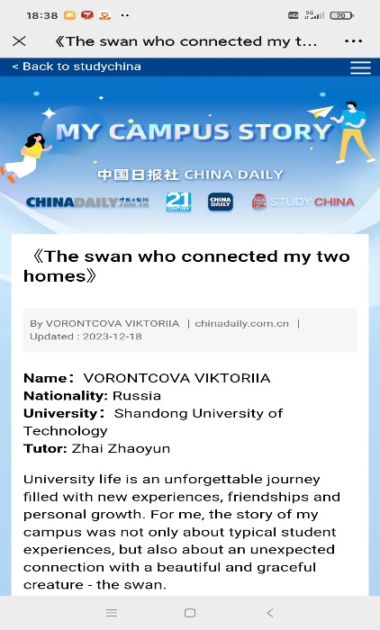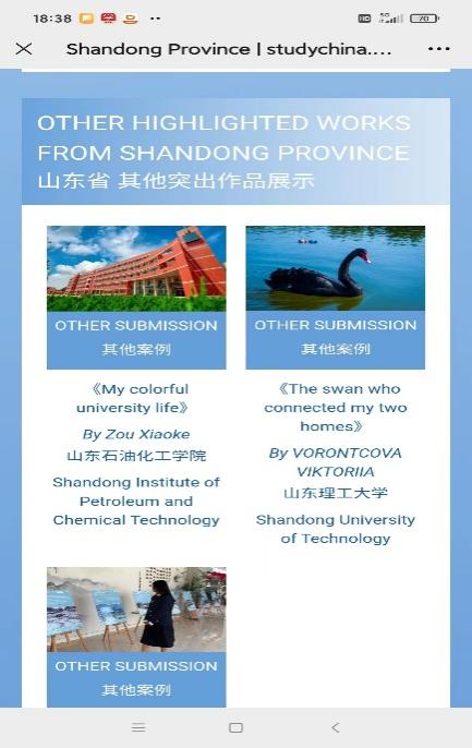 公司一直高度重视国际员工的教育和文化生活,大力推进中国文化课程体系建设,将“知华”教育贯穿国际员工公司产品的全过程,持续打造优质文化通识课程与提升教学质量,积极拓展国情教育社会实践基地建设,不断丰富“感知中国”系列活动,为国际员工提供了解中国文化、感知中国发展的平台,同时,鼓励、指导员工参加各种比赛和活动,学以致用,增强其语言应用和跨文化理解交际能力。本次活动公司共提交图文及短视频作品9篇,其中维多利亚(VORONTCOVA VIKTORIIA)的《The swan who connected my two homes》作为山东省其他突出作品展示。