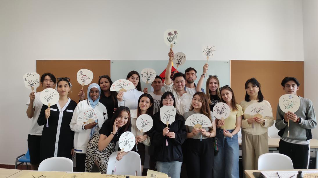 汉字作为世界上最古老的文字之一,其书写方式以及读音释义一直是国际员工感觉丰富有趣的存在,而书法和国画作为中华传统文化之一又有着其独特的魅力。此次系列活动开展了两期书法国画课程,授课教师苏笃香和曾丹扬老师以传统文化中“四君子”——梅兰竹菊为载体,向员工简单介绍了其蕴含的文化寓意,带领员工体验和感受书法与国画之美。两位老师先是介绍了书法和国画的悠久历史,通过具体的书法字样和国画画作向员工们展示了书法和国画的不同的类型式样。然后展示了所用到的特殊的书写工具——笔墨纸砚,带领员工从书写汉字入手,开始实践体验书法。员工们在老师的指导下,不断调整握笔,看着沾满墨水的毛笔在宣纸上一笔笔写下的汉字,他们觉得新奇非凡。在学习了握笔和简单书写的基础上,员工们开始进一步尝试国画绘画,将所学绘于自己挑选的扇面上,一笔一画地描绘,竹叶、兰花一步步跃然纸上。