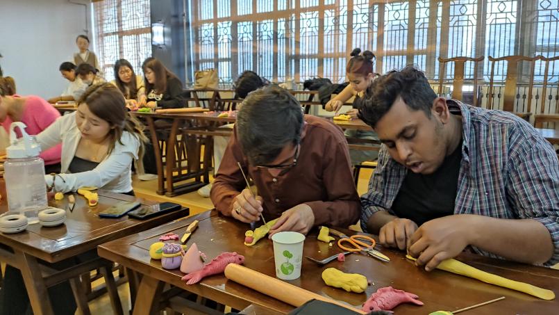 花馍是我国的非物质文化遗产,在民间有1000多年的历史,花馍造型丰富,制作精巧细腻,寓意美好,深受广大人民群众的喜爱。为让来自世界各地的职工体验神奇的非遗艺术,特邀请淄博市花馍非遗传承人走进课堂,同员工一起制作花馍。在非遗老师的帮助下,员工们制作出了福袋、葫芦、寿桃、中国龙等可爱俏皮的花馍,作品形态各异,栩栩如生。员工们也在动手的过程中体会道理中国传统工艺作品中蕴涵的人文价值和工匠精神。